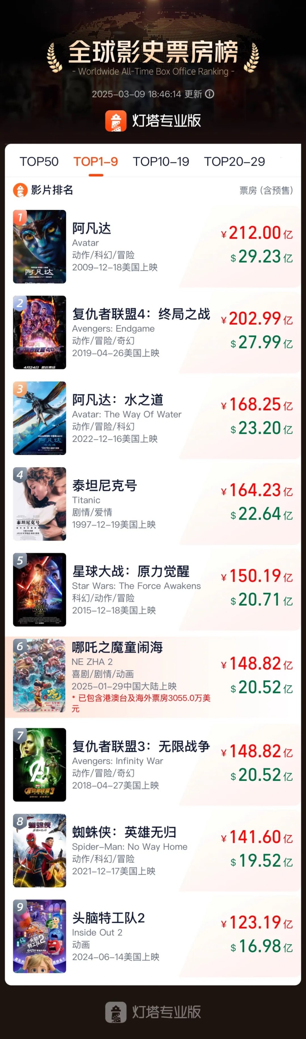 首页>内地>社会 《哪吒2》全球票房破148.8亿人民币,跻身全球影史票房前6 发布时间:2025-03-10 08:21 国产动画《哪吒之魔童闹海》(《哪吒2》)续刷新纪录。据据灯塔专业版全球票房榜,截至3月9日,《哪吒2》全球票房(含预售)已突破148.82亿元,超过《复仇者联盟3:无限战争》,进入全球影史票房榜前6名!此前《哪吒2》已连续创造多项纪录,成为全球动画电影票房榜TOP1,是中国电影史上首部、全亚洲首部票房过百亿的影片,并创造了全球单一电影市场最高票房纪录!▲《哪吒2》已进入全球影史票房榜前6名。 微博 热门文章 菲律宾前总统杜特尔特秘密到港,修顿场馆开党大会,大批在港菲律宾人到场 俄乌战争︱俄罗斯宣布大规模进攻库尔斯克,传乌军两周内撤退 尹锡悦获释返家吃泡菜锅,谈在拘留所“学到很多” 特朗普接受福斯专访,未排除今年美国经济衰退可能性 32蓝委面临罢免惨了?罗旺哲吁国民党出2招应对 前港姐冠军旧爱全裸出镜?狂用手抓下体动作猥亵,称性交是“蛋白质交换” 吴谦:2025年中国国防预算1.81万亿元 前“立委”郭正亮称美军要求台湾延兵役,美国务院:不评论私下沟通 叙利亚2天逾千死!政府军交火阿萨德残军,745平民遭处决 黄心颖胞姐黄心妙真空出街,不倒胸竟大缩水? 专题 更多 > 中芯国际上半年营收预计超22亿美元,四季度将试产7nm工艺 太兴盈喜料多赚逾3倍,指将坚守审慎理财政策 中国移动半年多赚5%,中期息增近6% 清华女学霸创业、一年一融资,镁佳股份估值9.3亿美元冲刺港交所 应收账款走高,丰沃股份三成收入打“白条” 惠科股份IPO:获政府补助超53亿,向实控人堂弟采购超8亿 关税战|白宫:特朗普签行政命令,对华关税暂缓期再延长90日 高盛:64%关税成本由美企“买单”,消费者仅承担22% 美媒:特朗普政府通过关税施压,要求买美国军火