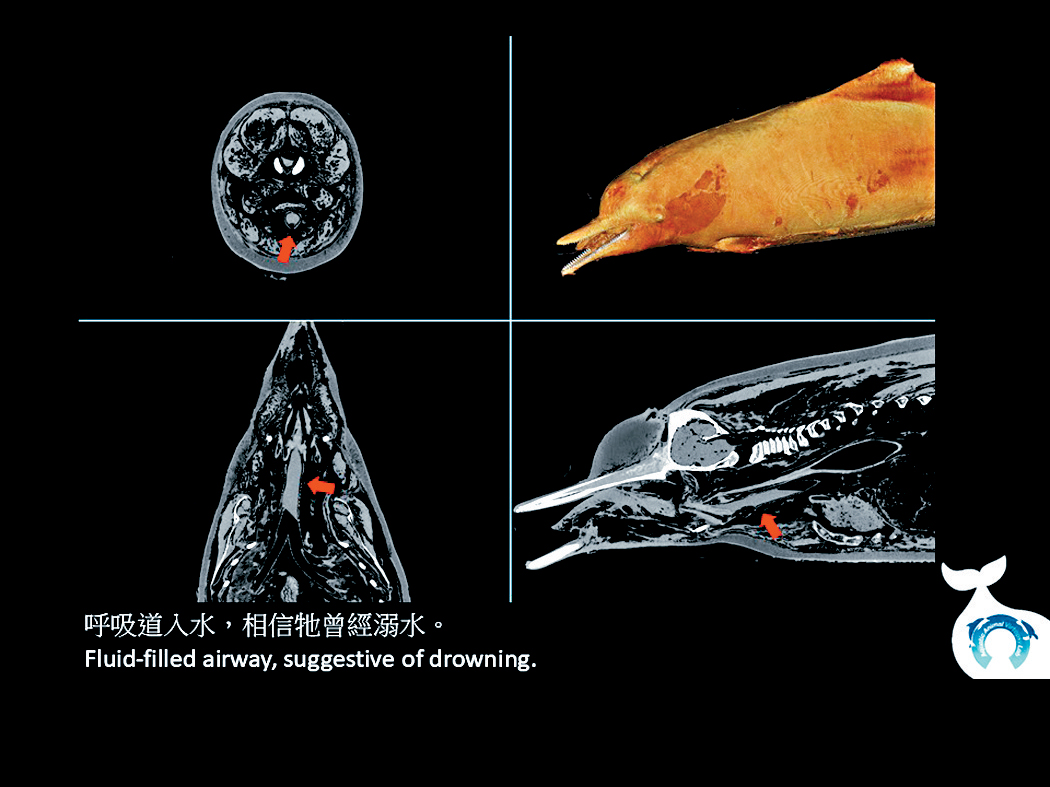 他指,经影像解剖发现该白海豚乳腺发达,估计刚分娩及正哺育幼豚,另外其呼吸道“入水”怀疑遇溺,肺气泡充满液体,出现“肺实变”现象,胃部亦留下2条未消化的鱼,推断其生前仍是健康及刚进食,但可疑之处是擅泳的白海豚竟然遇溺,估计死亡一刻来得非常突然,不排除与渔船作业有关。他指,事发经过固然成谜,亦担心诞下的幼豚情况,而该些事故正反映,海洋动物面对的生存威胁一直存在。