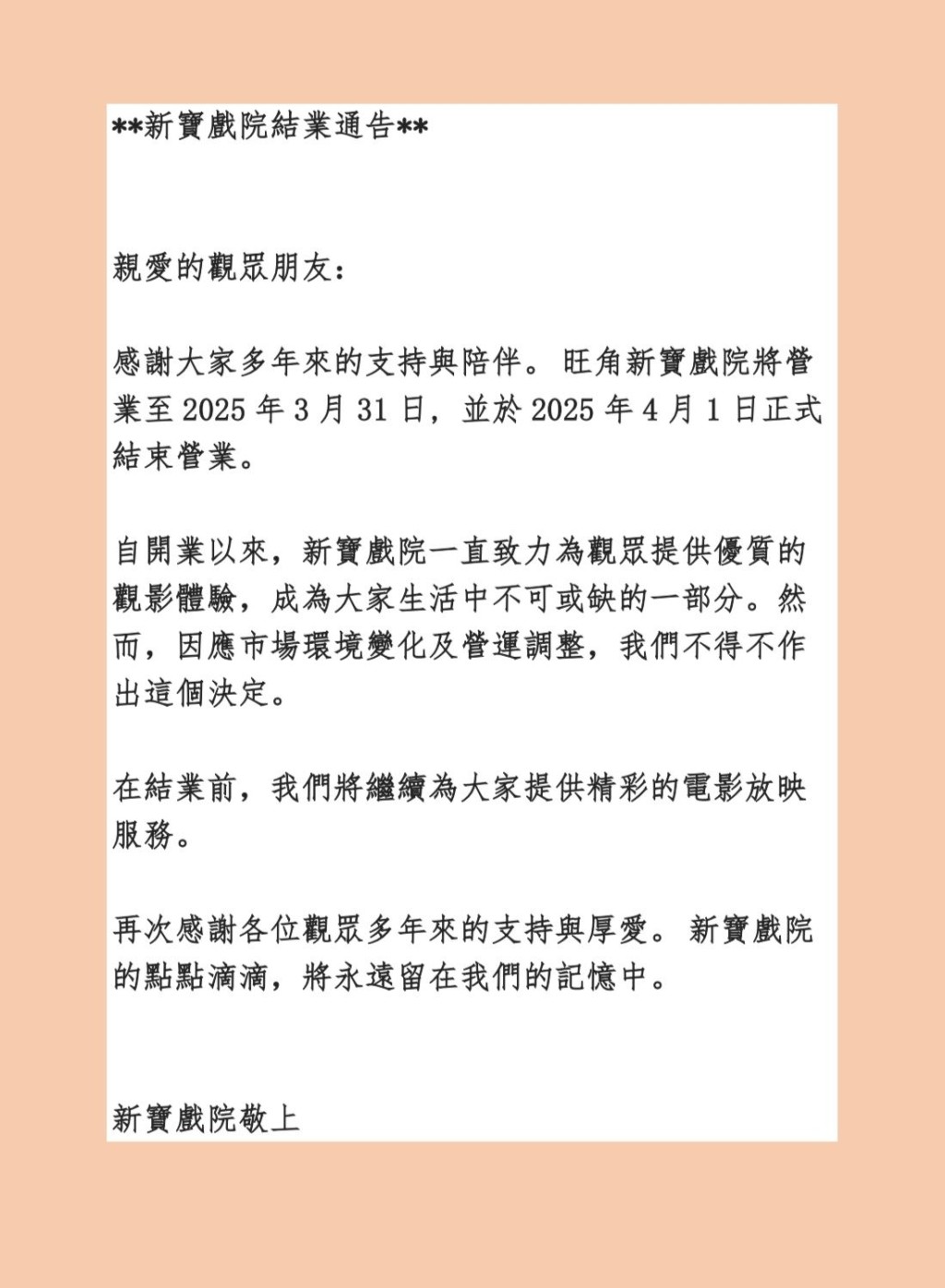 【新宝戏院/旺角/总统戏院/凯都戏院/结业】继铜锣湾总统戏院后,新宝院线再有戏院结业。新宝在社交平台宣布,旺角新宝戏院将营业至3月31日,4月1日正式结业。新宝表示,因应市场环境变化及营运调整,不得不作出这个决定,结业前将继续为大家提供精彩的电影放映服务,感谢观众多年来的支持与厚爱。