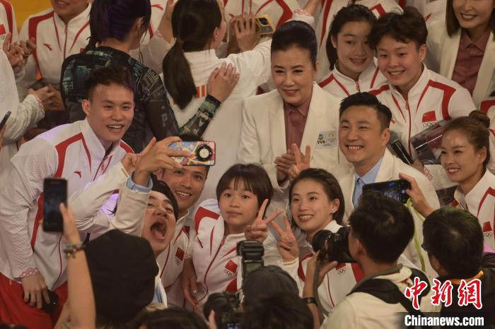 ▲2024年8月30日,访港的中国内地奥运健儿出席奥运健儿大汇演。图为香港艺人与奥运健儿自拍。 中新社