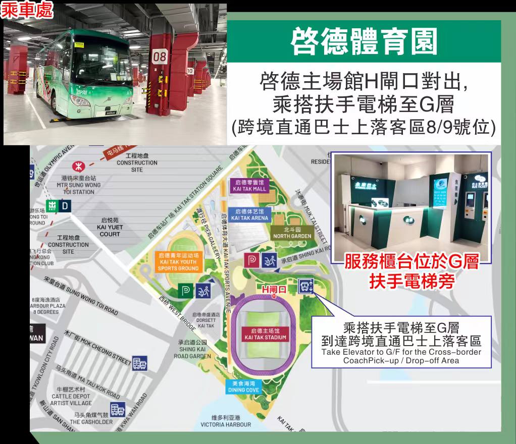 而永东巴士上下车点就设于启德主场馆的旅游巴上下客区的8/9号位,即H闸口对出,观众可乘搭扶手电梯至G层前往。这个上下客区是24小时全日运作,最多可同时容纳25架旅游巴,对于居住内地需往启德体育园的游客来说是非常方便。