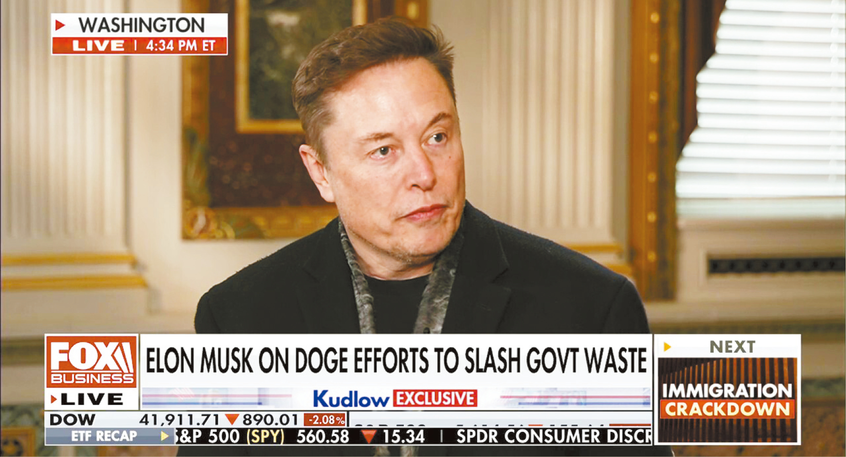 ▲马斯克10日罕有地亮相霍士材经新闻网,接受专访,大谈他掌管DOGE的未来工作方向和所面对的争议。 电视截图