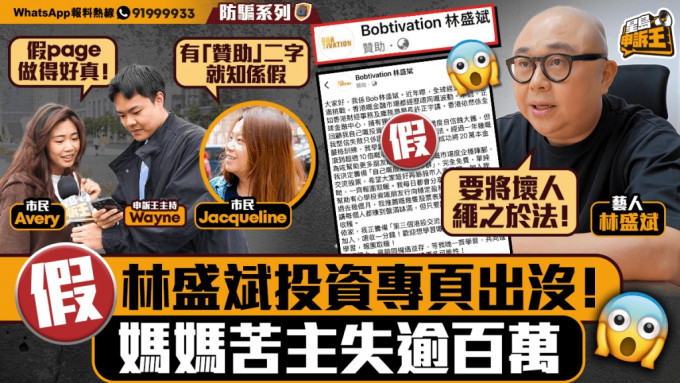 《星岛申诉王》曾多次报道知名人士包括艺人被冒名开设假专页骗局,提醒市民提防受骗。近日再有明星被骗徒冒认开设假专页,林盛斌(Bob)接受《星岛申诉王》访问时指,有人盗用他的照片及名字开设假专页及假WhatsApp投资群组设下骗局,有苦主因而损失过百万。目前Bob已向警方报案及发声明向大众澄清,直言“要将坏人绳之于法”。