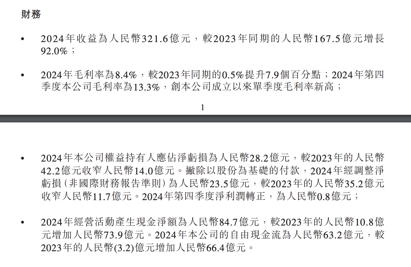 2024年,零跑汽车收益为321.6亿元,同比增长92%,毛利率为8.4%,较2023年同期的0.5%提升7.9个百分点。2024年第四季度公司毛利率为13.3%,创公司成立以来单季度毛利率新高。