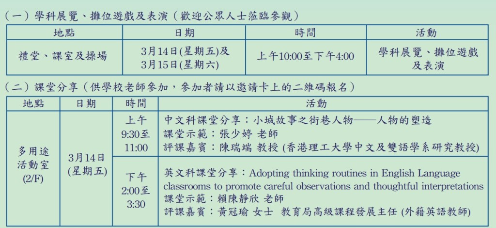 该校将于本月中举办开放日,活动包括校园游踪、学校活动展览、摊位游戏、动感南官及学生表演等。有兴趣的家长可到学校网页“开放日”的专页中报名。