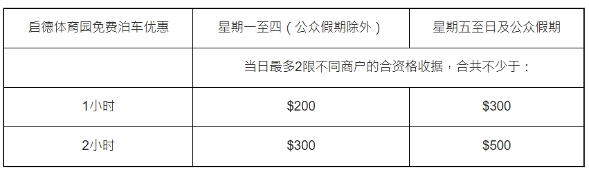 凡于启德零售馆消费满指定金额,即可享有最多2小时免费泊车优惠,惟免费泊车优惠不适用于日泊车辆,大型活动及特定日子,详情可以留意启德体育园提前公布。