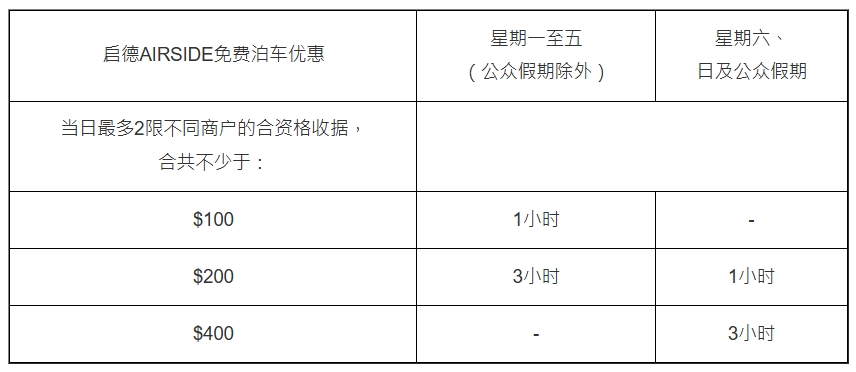 于启德AIRSIDE消费满指定金额,并以最多两张不同商户即日电子货币消费收据,可享以下免费泊车优惠: