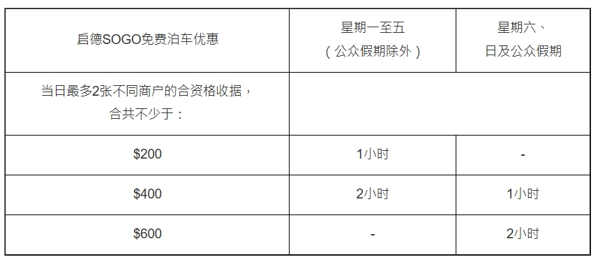在启德SOGO双子汇消费达指定金额,凭当日最多2张不同商家之电子货币消费发票(每张发票最少$100),即可获得免费泊车服务。