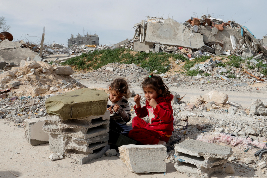 ▲2025年3月13日,巴勒斯坦儿童坐在拉法遭到毁坏坍塌的房屋中。路透社