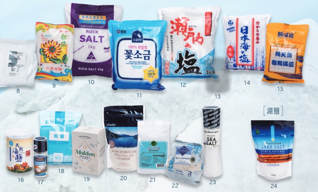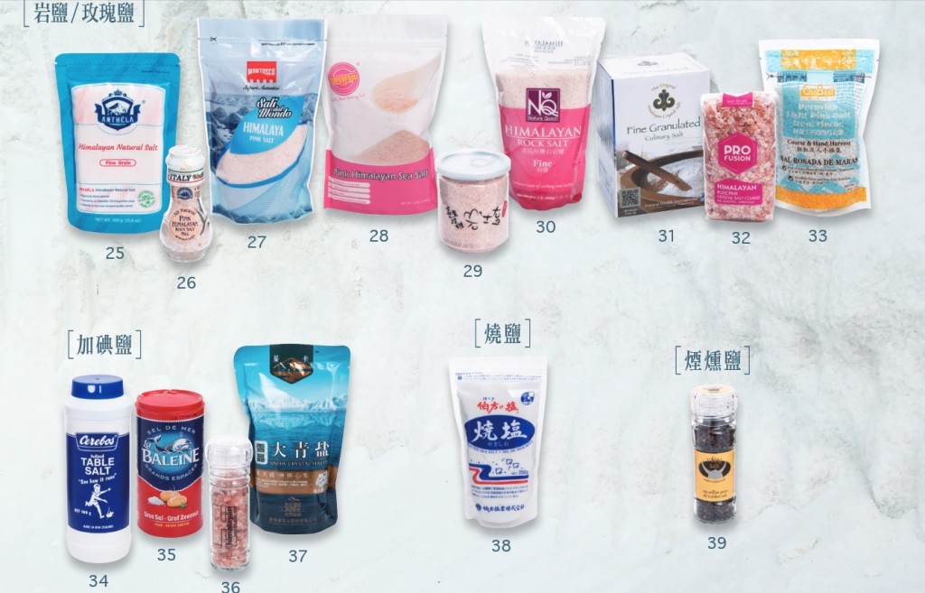 消委会曾经检测市面上39款预先包装食盐样本,包括4款餐桌盐/烹调用盐、19款海盐、1款湖盐、9款岩盐/玫瑰盐、4款加碘盐、1款烧盐和1款烟熏盐。样本价钱介乎2.6至440港元之间。