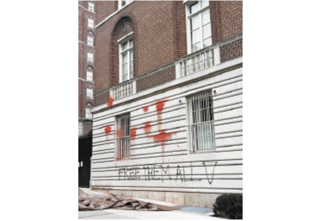 ▲哥大校长官邸被扔红色油漆气球。 X图片