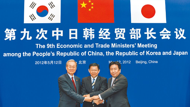 ▲中日韩三国正在协调,将于3月29至30日在韩国首都首尔,举行三国经贸部长会议。图为2012年5月,第九次中日韩经贸部长会议。(新华社)