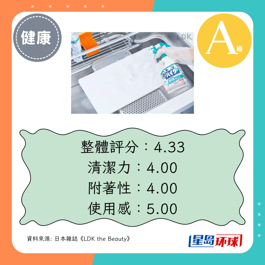 第1位(4.33分):KAO花王厨房除菌漂白泡沫喷雾清洁剂(日圆¥345,约HK$18)