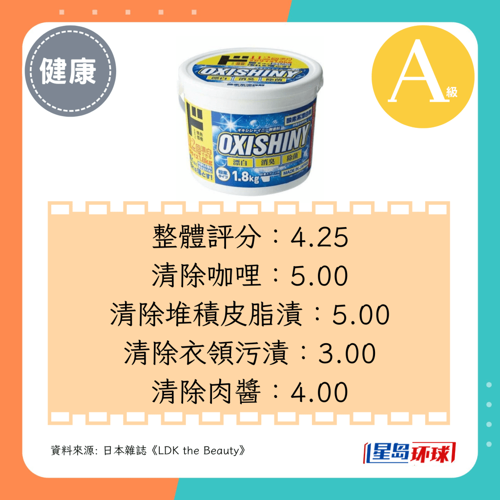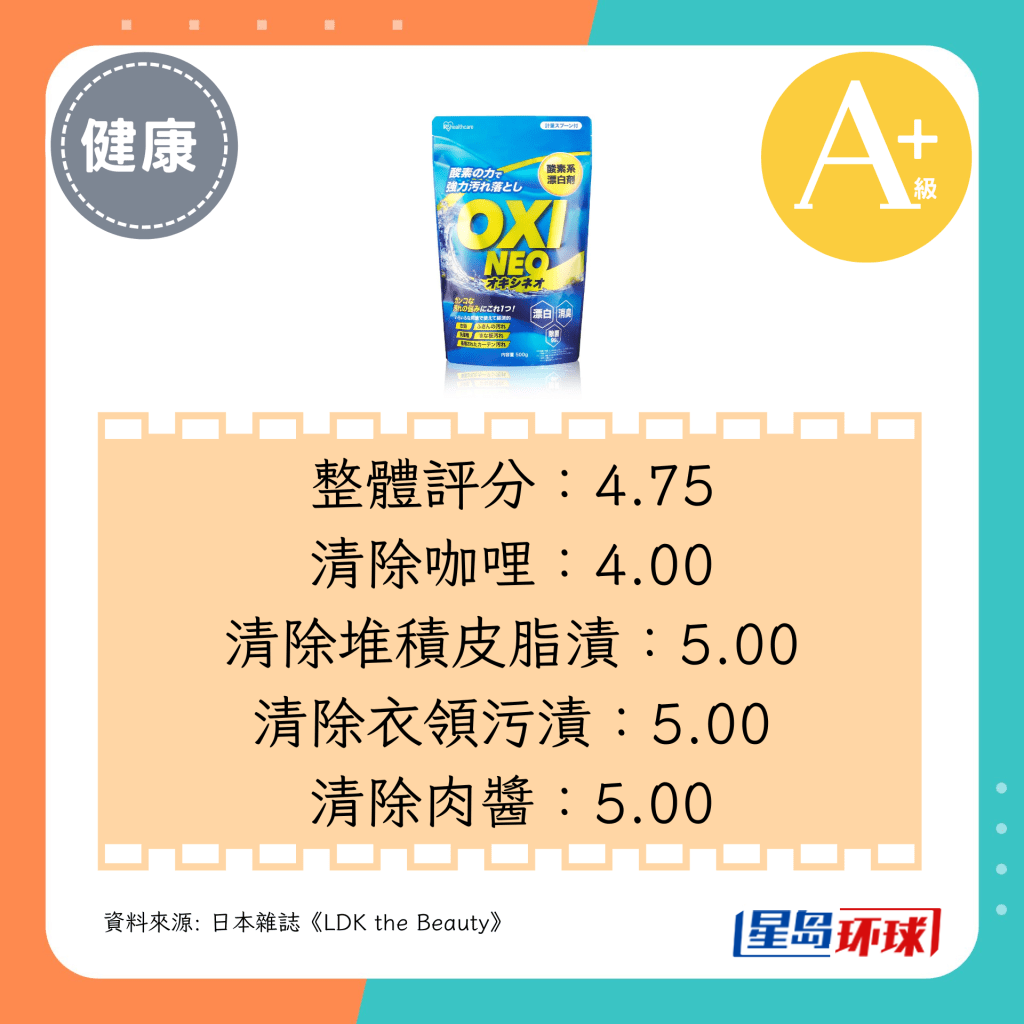 第1位(4.75分,A+级):IRIS OHYAMA OxiNeo粉末漂白剂(日圆¥798,约HK$42)