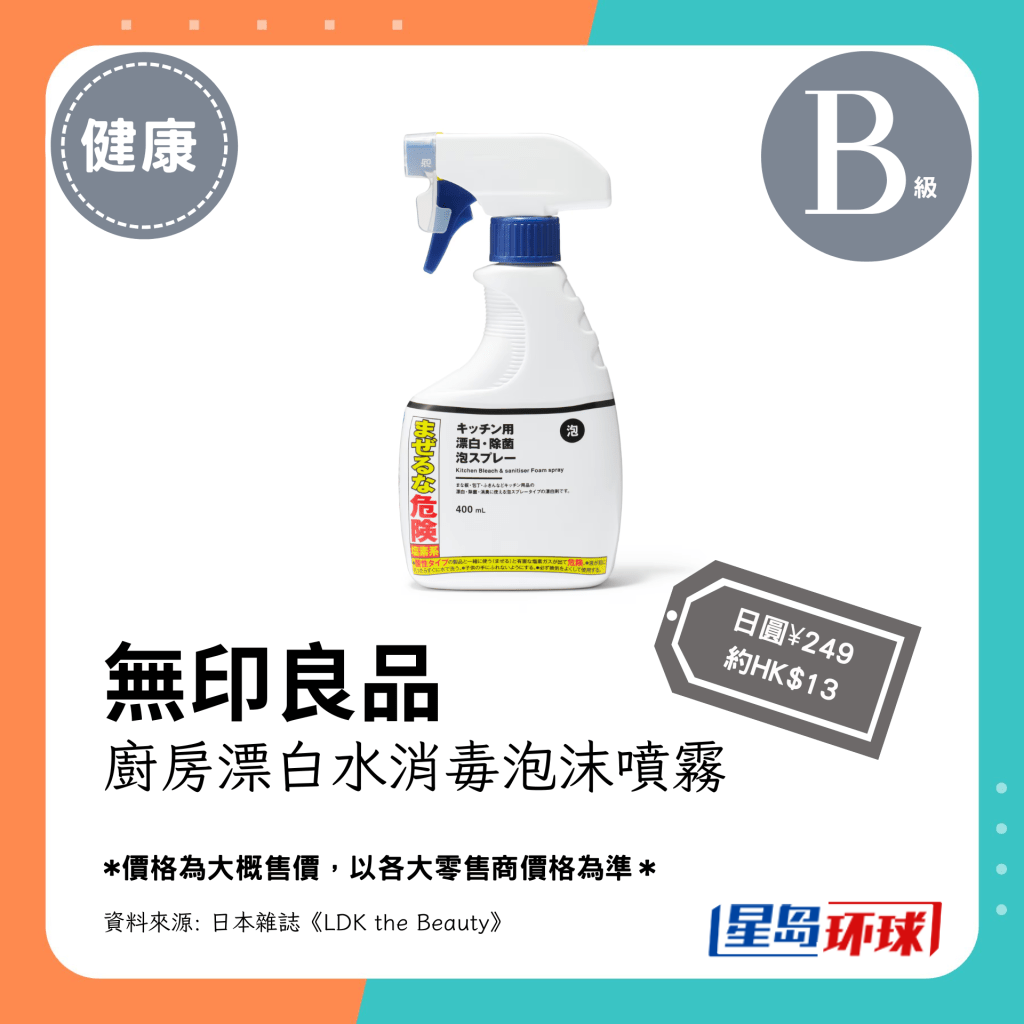 ▲第4位(3.17分):无印良品厨房漂白水消毒泡沫喷雾(日圆¥249,约HK$13)