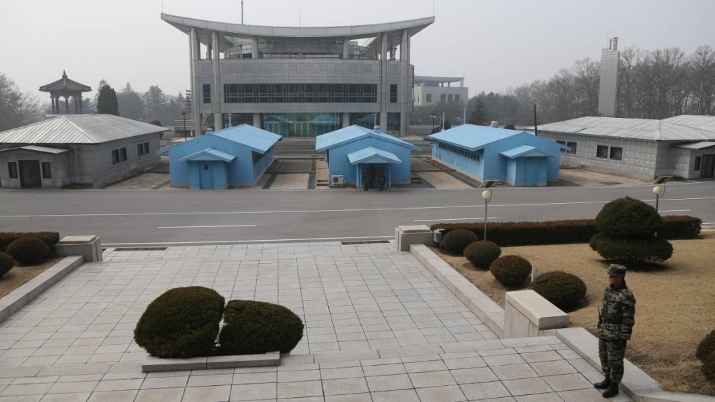 ▲朝鲜板门店共同警备区内的军事分界线和附近建筑。新华社