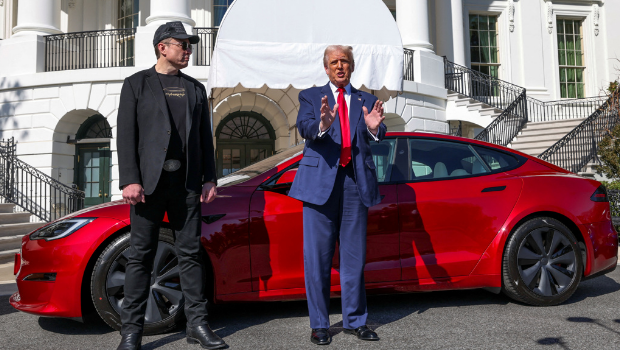 ▲电动车大厂特斯拉老板马斯克11日把特斯拉新车运到白宫,与特朗普一同赏车。 (路透)
