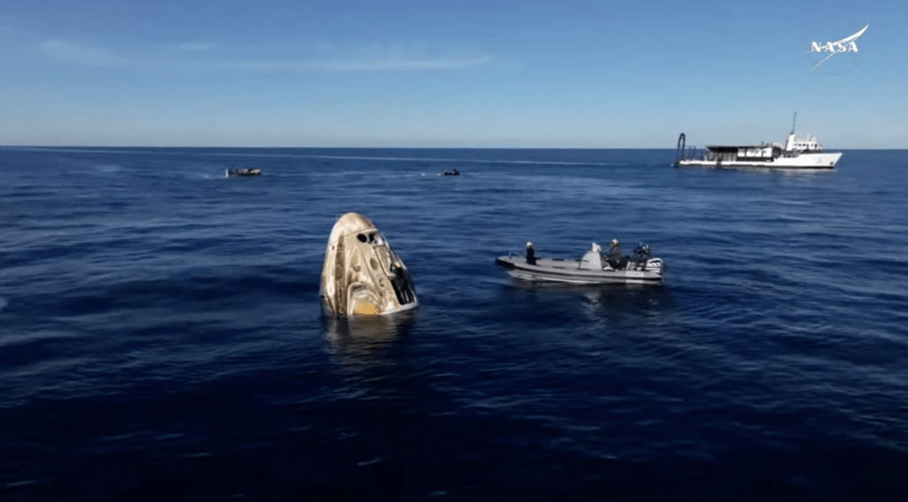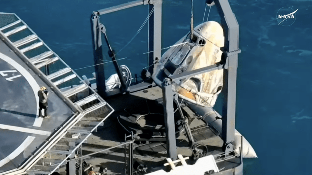 ▲太空人悉数离开太空舱被载走后,太空舱被捞起回收。NASA影片截图