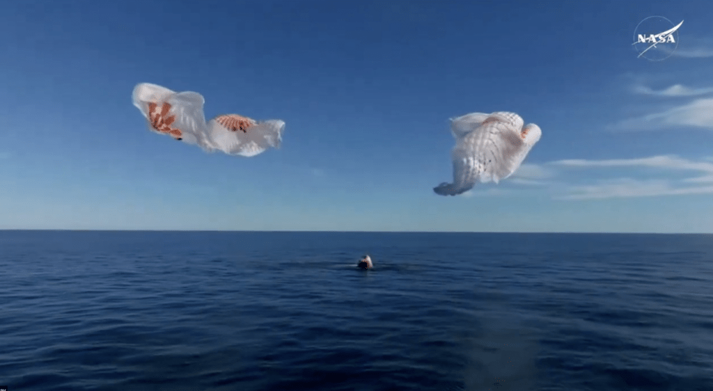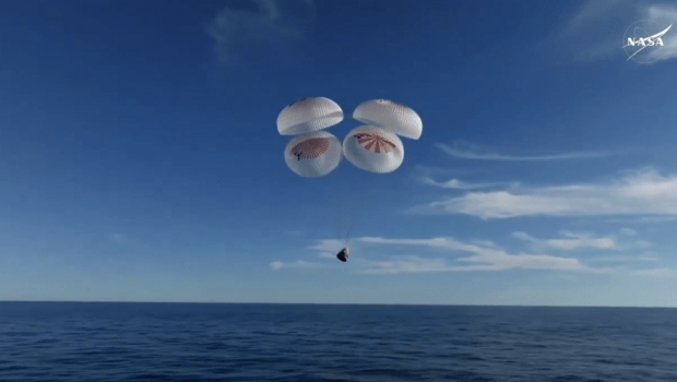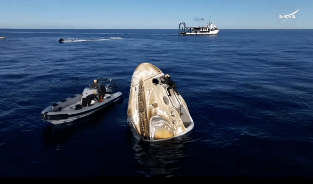 从美国太空总署NASA的直播画面可见,载人太空舱由四个降伞带着缓缓降在海面上,然后有橡皮艇驶近,太空舱内的太空人逐一爬出,并落到橡皮艇上,安全“着陆”,再由橡皮艇载走。