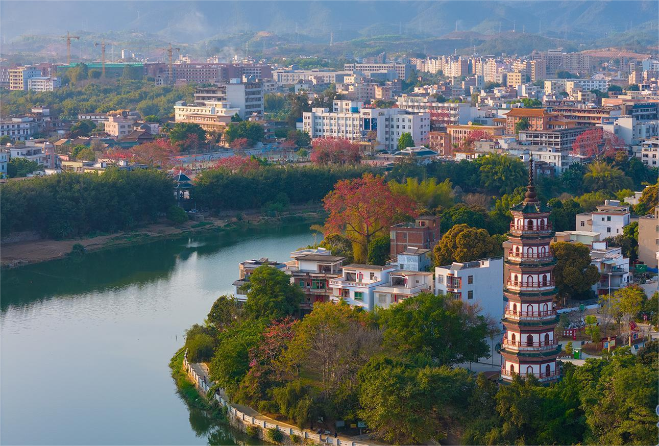 穿梭在黄花风铃木间,云浮罗定的多重时空在交叠。玉堂春的粉雪落在昔年学宫士子的肩头,木棉的赤焰融入泷江两岸的晚高峰车流,向日葵的金芒闪耀在水波不息的旧日渡槽……轻叩文塔塔砖,层层叠叠的春天正同罗定共鸣,挥毫写就一篇光阴淬炼的锦绣文章。