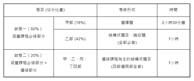 卷一乙部结构式题目、论述题:论述题约15分钟,馀下做结构式题目。惟开首的题目与后半部题目长度及深度有别,宜“留前斗后”,并预留时间覆卷。