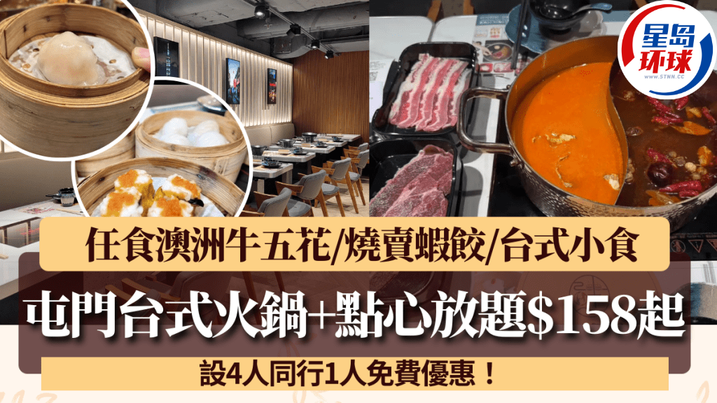 屯门台式火锅+点心双重放题$158起!屯门一间主打手作点心及火锅放题餐厅推出台式火锅加港式点心双重放题,人均$158起就可以任食各款火锅配料及港式点心,包括澳洲无激素穀饲牛五花、牛板腱、牛舌芯、虾饺及烧卖等,同场更有多款台式小食供应,最多食足两小时,即日起更推出晚市优惠,四人同行一人即享免费,即睇详情!