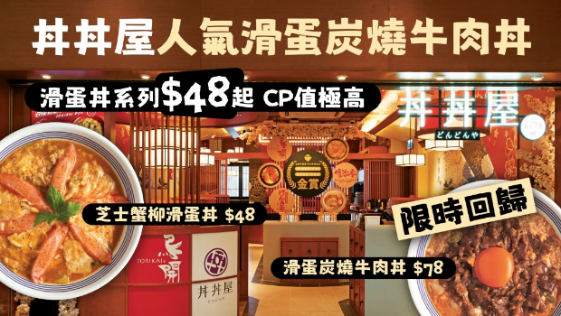 丼丼屋的人气滑蛋丼系列以嫩滑滑蛋,配搭日本产A级米,难怪成为人气丼之最。最近人气热卖“滑蛋炭烧牛肉丼”限时回归,焦香肉汁与日式滑蛋交融,炭香四溢,一众丼饭迷可以大饱口福;“滑蛋吉列猪扒丼”则有外酥内嫩的吉列猪扒,啖啖香脆;至于“芝士蟹柳滑蛋丼”就有浓郁拉丝芝士及与鲜甜蟹柳,$48 CP值极高。优惠期间以超值价$78惠顾“滑蛋炭烧牛肉丼”,即送前菜及果茶,另可以优惠价加配炙烧焦糖芝士蛋糕以及厚切三文鱼帆立贝刺身。