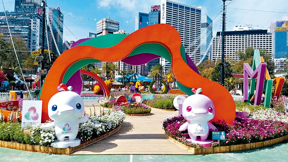 为迎接即将举行的第十五届全国运动会和全国第十二届残疾人运动会暨第九届特殊奥林匹克运动会,花展特别以“悦”与“动”为主题,结合秋英与各色花叶植物,并设置五个与运动相关的新月形艺术装置,赏心悦目。另外更有全运会吉祥物“喜洋洋”和“乐融融”的巨型挂幕让市民打卡,进一步提升全城的运动热情。