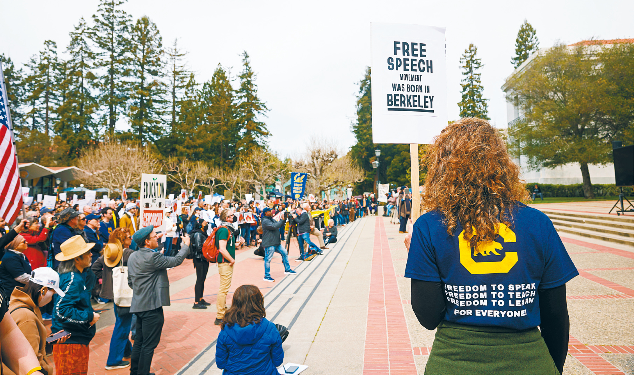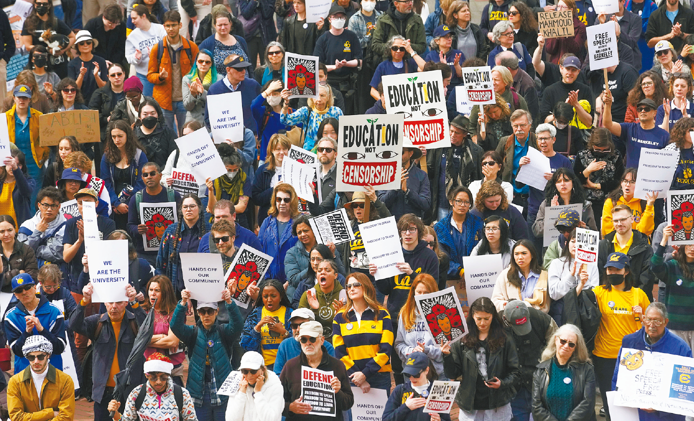 数百名教授、教职员和学生在柏克莱加大(UC Berkeley)的斯普劳广场(Sproul Plaza)集结,谴责特朗普政府削减大学研究资金的计划,并批评其对校园多元化政策的打压。