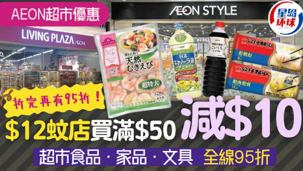 AEON“感谢日”大减价开锣!由即日起一连4日全线AEON超市分店、$12蚊店Living Plaza及Daiso Japan都推出激抵优惠!AEON会员于超市购买急冻食品、生果、饮品及麵类等货品,即可享照价95折优惠,网购同步有优惠。而于LIVING PLAZA及DAISO Japan购物满$50,即减$10,会员再可享折上折95折,即睇AEON优惠详情!