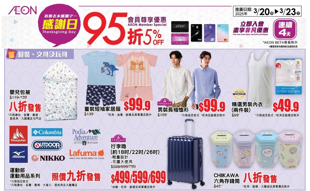 由即日起至3月23日,AEON超市会推出“感谢日”大减价优惠。优惠期间凭会员卡或指定AEON信用卡,并以指定方式付款购物,即可享照价95折优惠。当中部分商品更减价中,例如公仔点心$49.9/4件、超特大虾仁$89、中国云南珍宝DRISCOLL’S蓝莓$32.9、日清OILLIO芥花籽油$32.9、婴儿湿纸巾$16.9/2件、轻量红色易洁煎锅$69.9及Chiikawa六角存钱筒8折等,网购同样可享优惠。