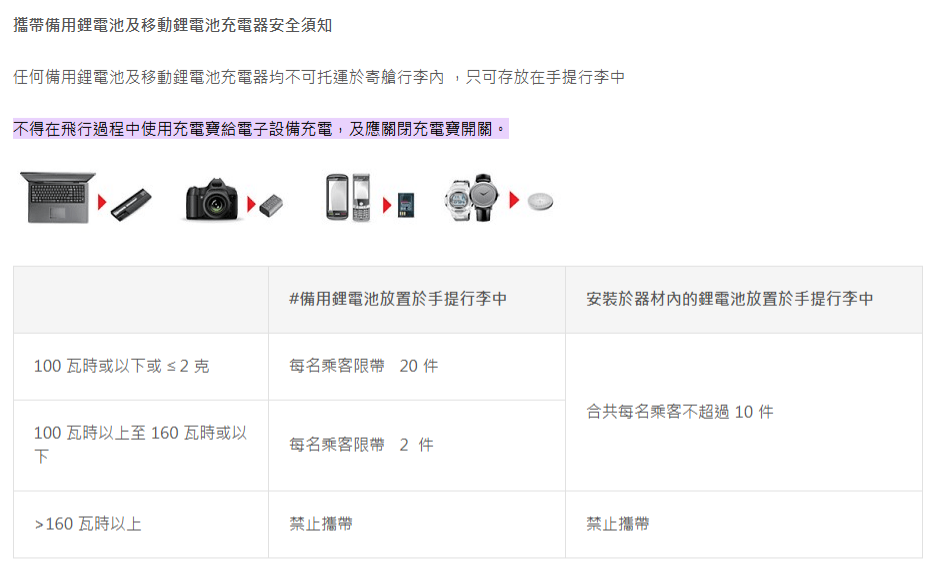 香港快运则表示,任何类型的备用电池,包括金属锂电池、锂离子电池或锂电池置于託运行李时均是禁止携带,手提行李则每名旅客只可携带最多2件备用锂离子电池(100瓦时以上至160瓦时或以下),而且必需独立包裹电池以防止意外地启动。
