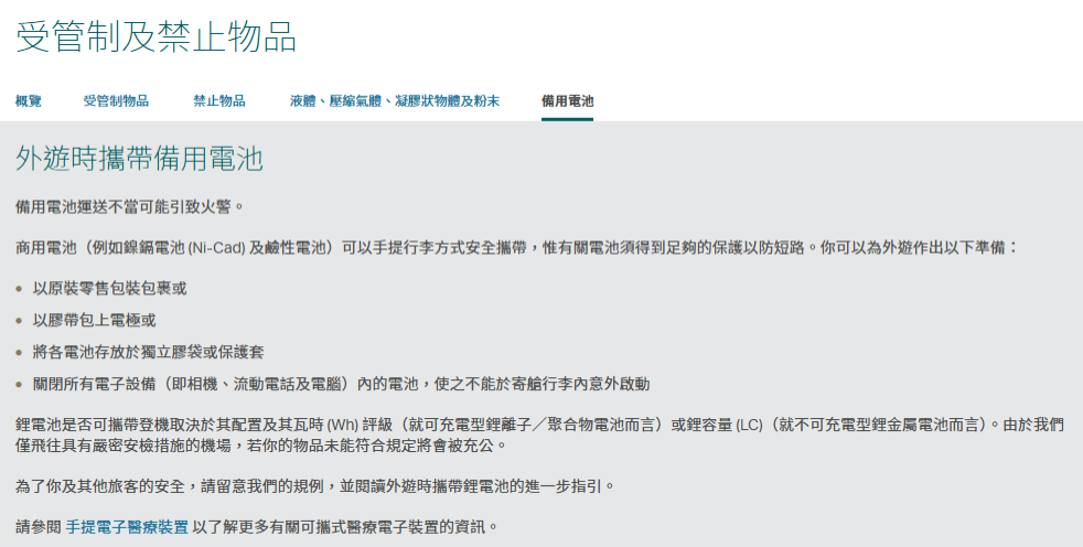 ▲国泰航空官网列明,商用电池可以手提行李方式安全携带,惟有关电池须得到足够的保护以防短路。