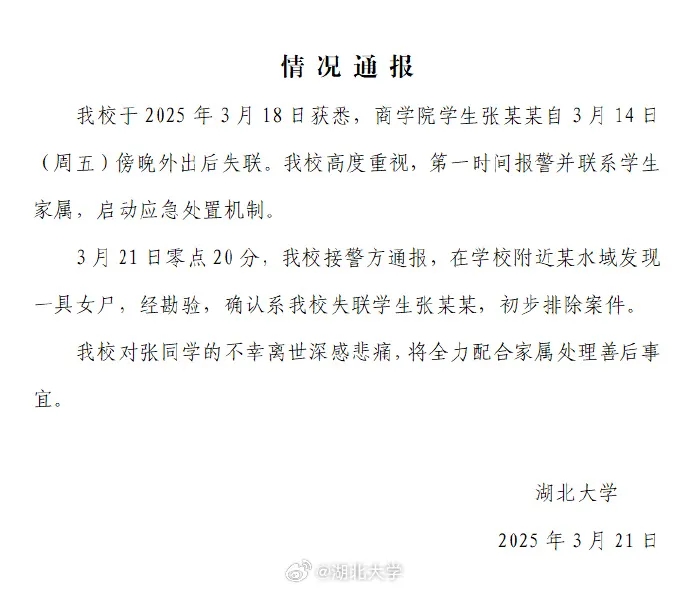3月21日,湖北大学发布情况通报: