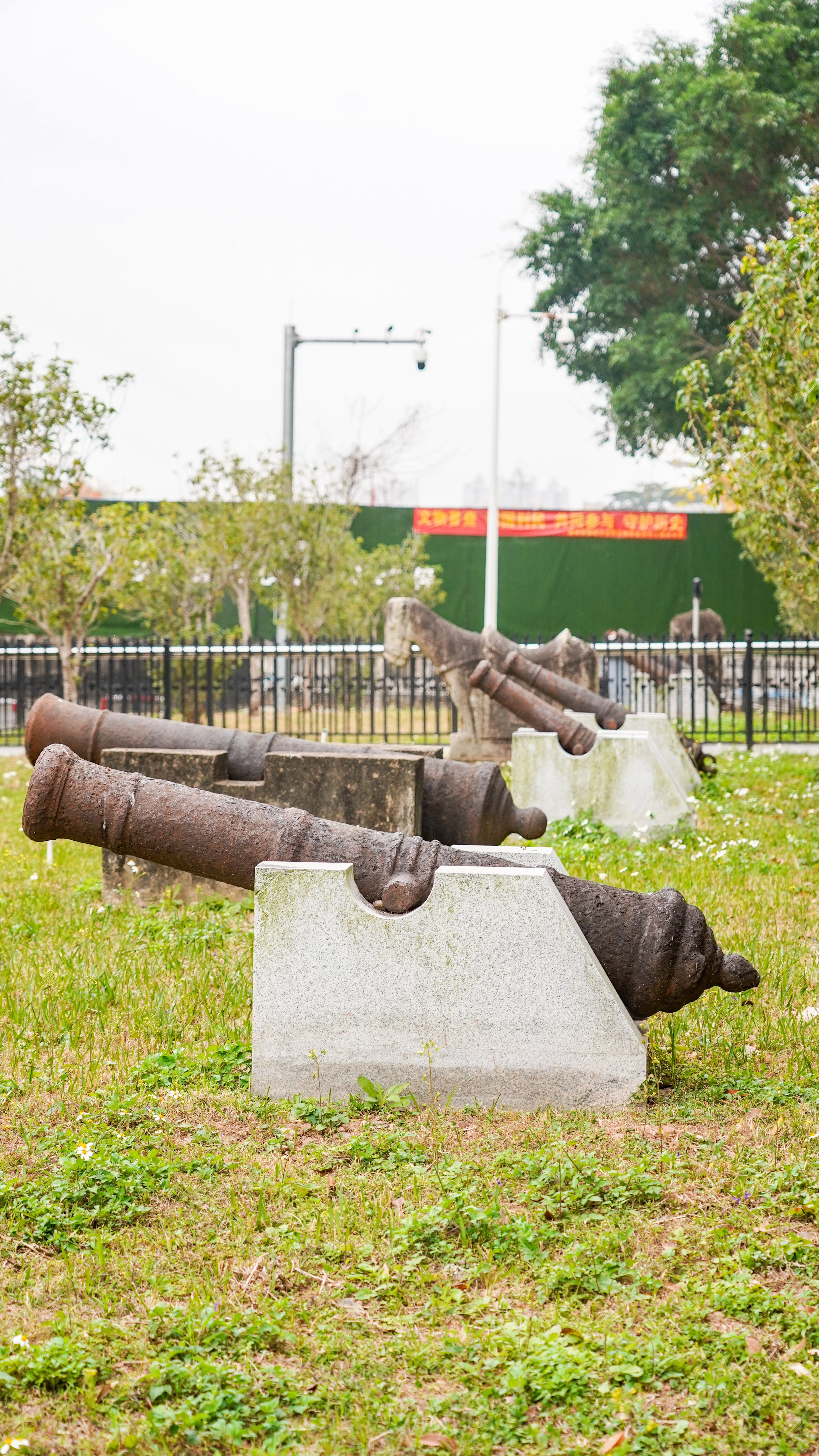 在惠州市博物馆,行人每天来来往往。一楼户外展区长年安放着13门清代铁火炮,吸引着人们的目光。铁火炮铸铁锻造,形制古朴,炮身有两三米长,被岁月侵蚀的斑驳锈迹清晰可见。
