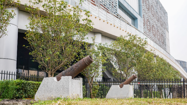 ▲惠州市博物馆户外展区常年安放着13门清代铁火炮,吸引着人们的目光。