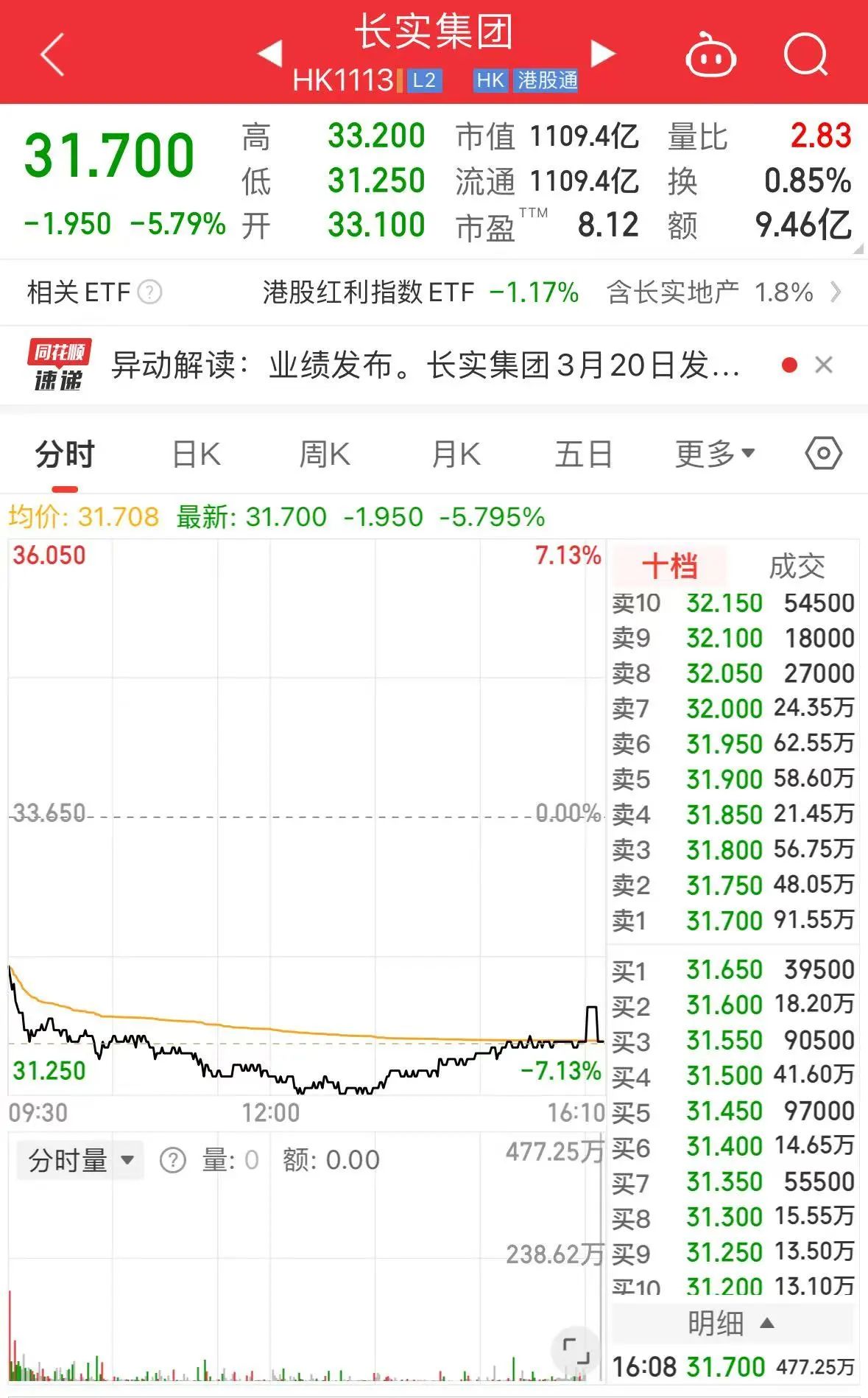 截至收盘,长和跌超3.5%,长实集团跌超5.7%,盘中一度跌超7%;和黄医药跌超5.6%,盘中一度跌超8%。长江基建集团涨0.6%。