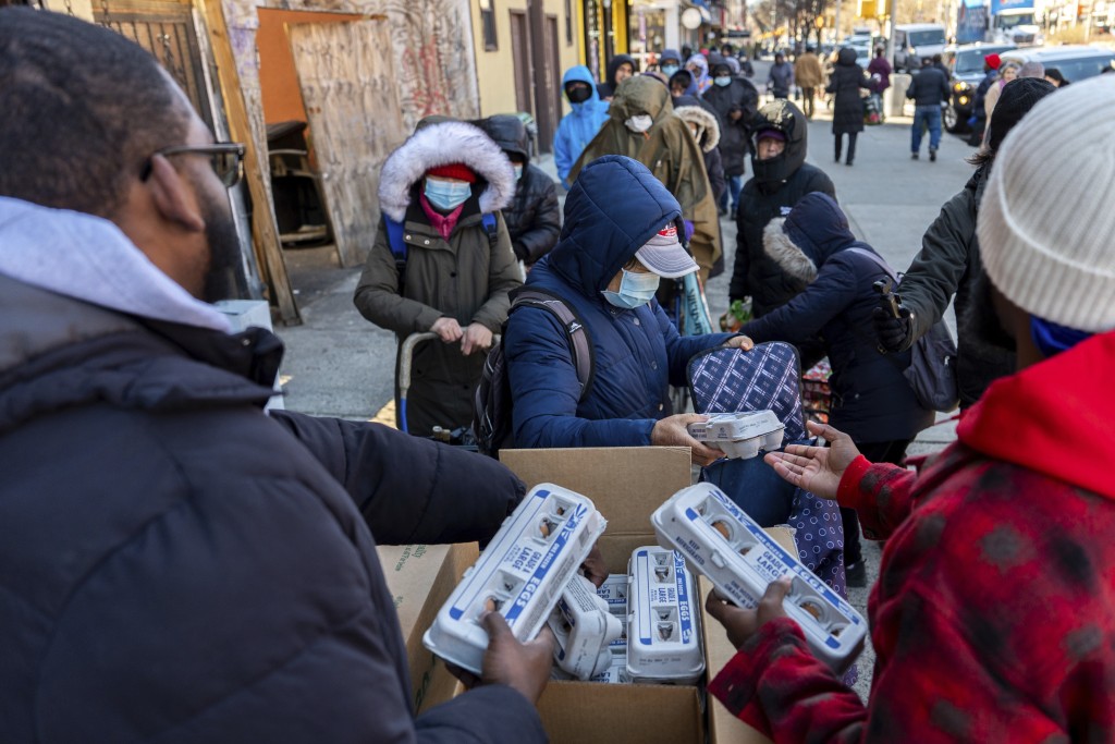 ▲在纽约哈林区,Abou Sow 向排队的人们发放FarmerJawn Agriculture 提供的免费鸡蛋。 美联社