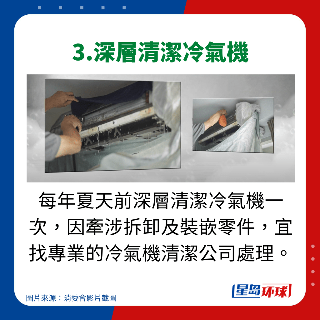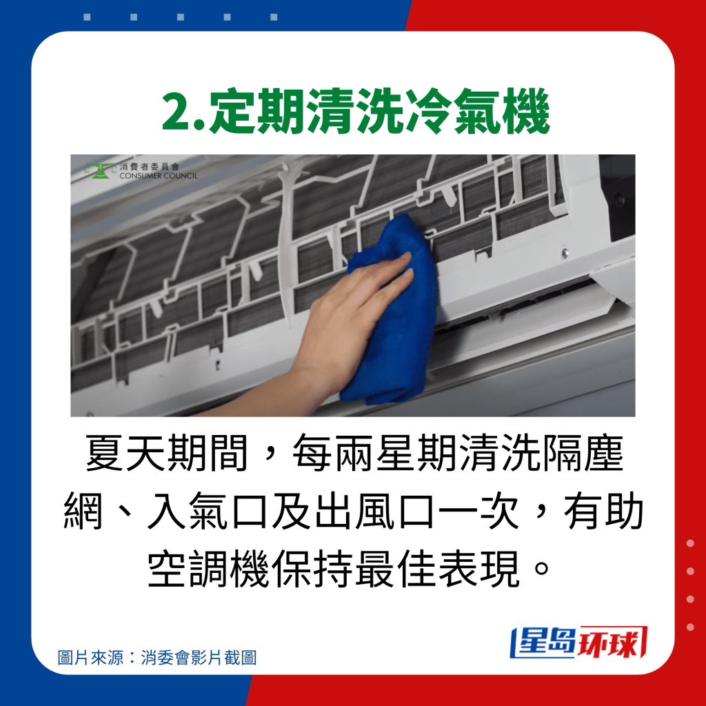 适当使用及保养,才能将空调的效果发挥得更好。消委会曾分享过使用空调的贴士,指出若想空调既省电又耐用,可以配合电风扇一起使用。利用电风扇将空调吹向自己,便无需将空调的温度调得过低,从而节省能源。此外,定期清洁空调亦十分重要。消委会建议,每年夏季开始前应进行一次深层清洁,而在夏季期间则应每两星期清洗一次隔尘网、入气口及出风口,以确保空调能维持最佳效能。