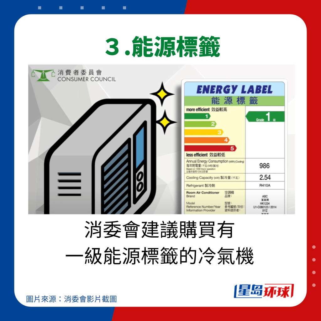 根据机电署的强制性标签计划,产品的能源效益会被划分为五个级别,方便消费者选择节能产品。空调若获得1级能源标签,代表其能源效益属市面上最高之一;而获得5级能源标签的空调,则属能源效益最低的产品。