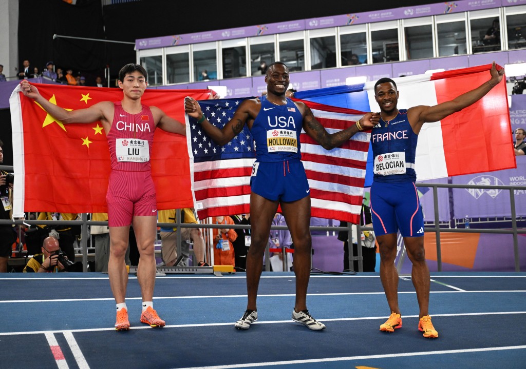 ▲冠军美国选手霍洛威(中)、亚军法国选手贝洛西安(右)和季军中国选手刘俊茜在决赛后合影。新华社