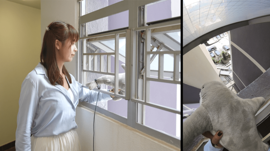 ▲《星岛申诉王》记者用绳系好毛公仔,在屋邨内一幢大厦5楼走廊气窗实测高空掷物监察系统。