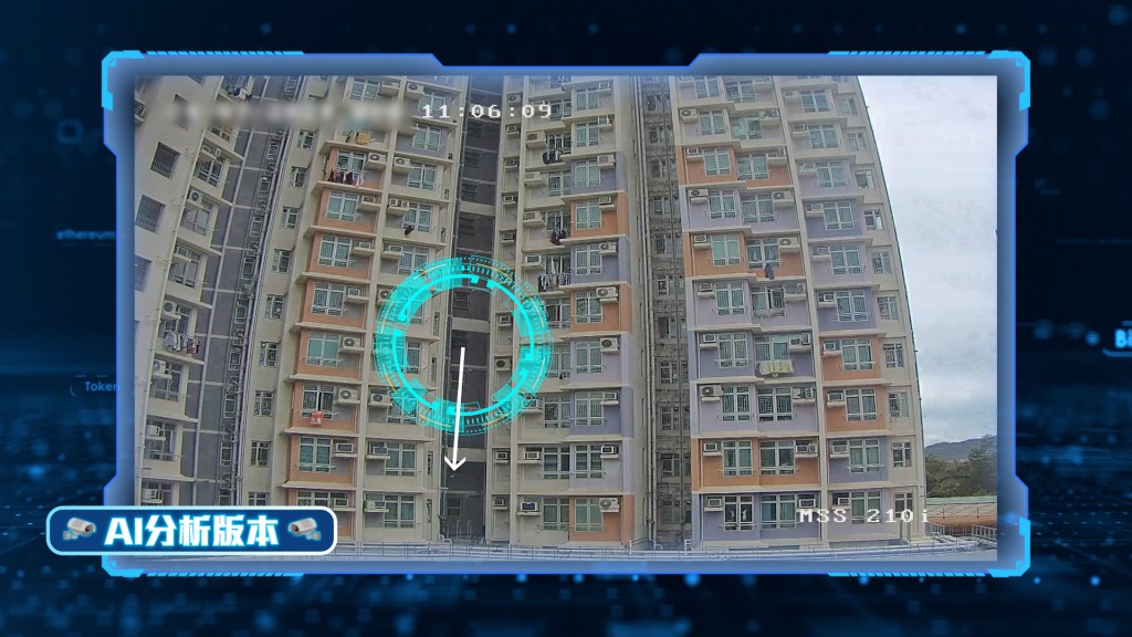 从今次实测的人工智能分析片段可见,片段以线条标示记者掉落物体的轨迹,并以圆圈突显掉落物体的起点,成功并迅速锁定记者模拟高空掷物的位置。屋邨职员在找出高空掷物位置时,只需抽出掉落物的一分钟片段,大大减省以往需观看全部录像片段的时间,同时降低人为错过掉落物的可能性,从而提升准确性。