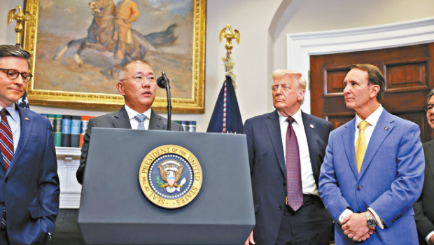 ▲现代汽车董事长郑义宣(左)、路州州长兰德里(右),在白宫宣布这项投资计划。 路透社