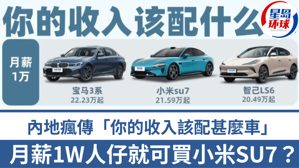 近日内地社交平台就流传“你的收入该配什么车”列表,分别列出由月薪200元(人民币,下同)到100万该配的座驾。