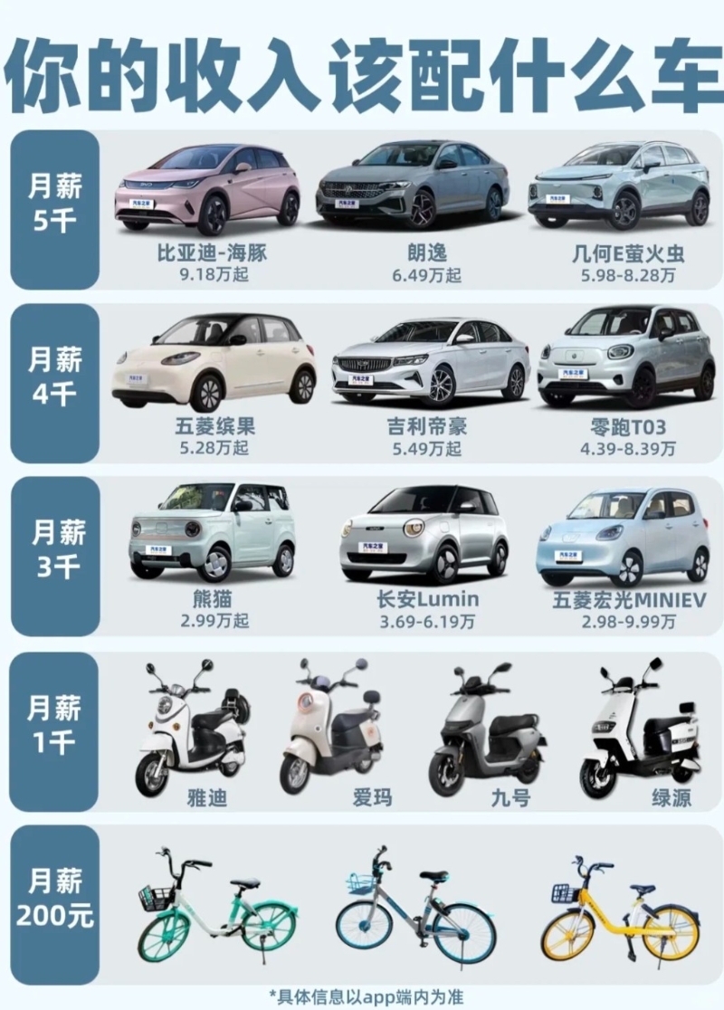 香港地少人多,日常生活乘搭公共交通工具基本上都能解决出入问题,汽车变相成为奢侈品。不过,远在其他国家私家车就是日常代步必需品,至于驾驶什么级数车辆,当然取决于自己的负担能力。近日,内地社交平台小红书流传一个“你的收入该配什么车”的列表,分别列出由月薪200元到100万元该配的座驾,究竟月薪200元又有什么选择?