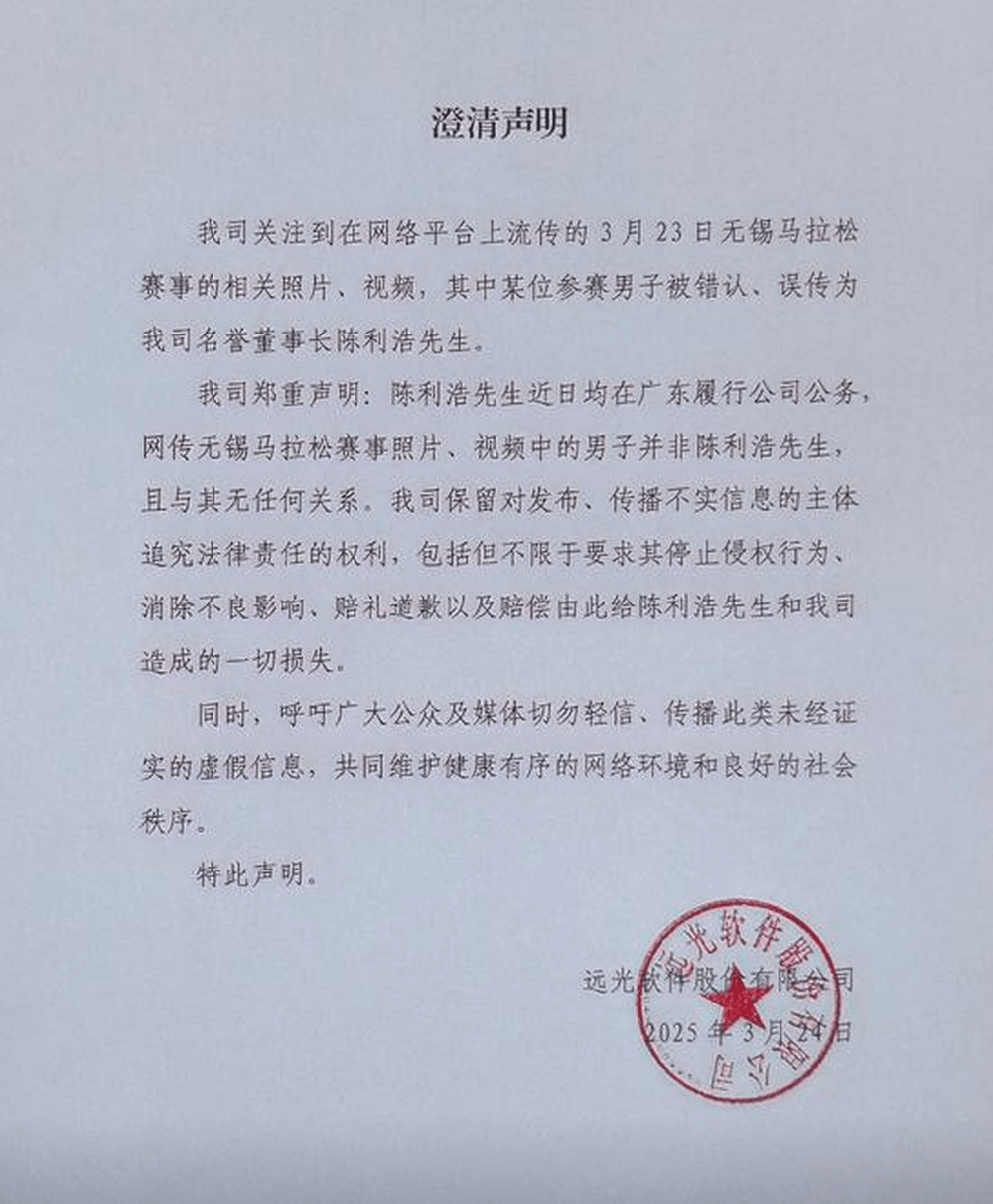 不过,3月25日,远光软件股份有限公司官方微信公众号发布澄清声明,称网传无锡马拉松赛事照片、视频中的男子并非陈利浩,与他没有任何关系。