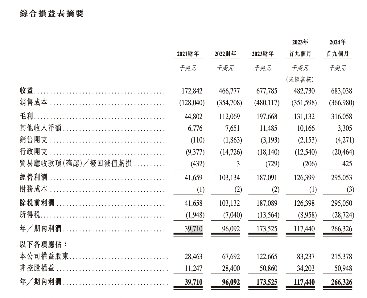 据招股书,2021年-2023年及2024年前9个月,南山铝业国际实现收入分别约为1.73亿美元、4.67亿美元、6.78亿美元、6.83亿美元;期内利润分别约为3971万美元、9609.2万美元、1.74亿美元、2.66亿美元。