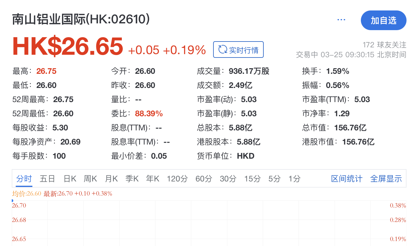 3月25日,南山铝业国际(02610.HK)在港交所挂牌上市,独家保荐机构为华泰国际。其开盘报26.65港元,涨0.19%,总市值约156.76亿港元。