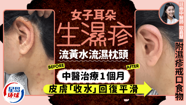 注册中医师欧嘉慧分享湿疹病例指,该名46岁女子患泛发性湿疹十多年,湿疹的分布最初以颈项、腰间、大腿内侧为主。求诊前半个月因进食过量生冷及煎炸油腻食物,令耳部湿疹加重。耳廓流黄水、结黄痂,影响日常生活及睡眠。